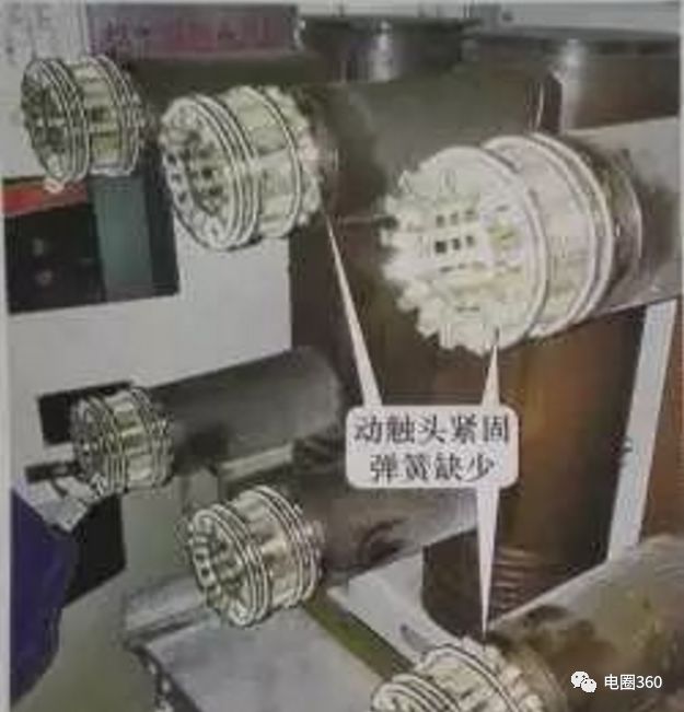 經(jīng)專業(yè)人員檢查,確定母線室和后下柜無發(fā)熱開關(guān)柜,手車甲、乙相母線側(cè)動(dòng)、靜觸頭和甲相下動(dòng)、靜觸頭的觸頭部分發(fā)熱。開關(guān)柜電源故障檢查:將手車?yán)鰴C(jī)柜。發(fā)現(xiàn)一個(gè)壓縮彈簧在手車的a相母線側(cè)(上部)上的移動(dòng)觸點(diǎn)的端部缺失,并且一個(gè)壓縮彈簧在手車的a相母線側(cè)上的下移動(dòng)觸點(diǎn)的導(dǎo)電桿和b相母線側(cè)上的移動(dòng)觸點(diǎn)的絕緣外殼側(cè)缺失(見圖17)。當(dāng)檢查手車的靜態(tài)接觸情況時(shí),發(fā)現(xiàn)相應(yīng)的靜態(tài)接觸箱中有一個(gè)松動(dòng)的壓縮彈簧(見圖18)。