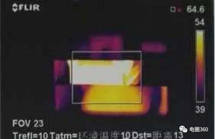 3天后,檢查10KV號(hào)主進(jìn)線柜是否停電。將手車?yán)鰴C(jī)柜,并立即對(duì)手車進(jìn)行紅外測(cè)溫(剩余溫度)。手車b相動(dòng)觸點(diǎn)的總溫度為42°。7℃(剩余溫度)(見圖12),b相動(dòng)觸頭前端溫度為46℃(剩余溫度)(見圖13),手車母線側(cè)靜觸頭溫度為48。5℃(剩余溫度)(見圖14),0+后穿板套管溫度為39.2℃(剩余溫度)(見圖15),0+前后手車母線側(cè)靜觸頭盒附近母線排溫度為64.6℃(剩余溫度)(見圖16)。這證明手車的手動(dòng)觸點(diǎn)和靜態(tài)觸點(diǎn)的接觸部分不是熱點(diǎn),開關(guān)柜后面的穿板套管也不是熱點(diǎn)。1號(hào)主進(jìn)線柜手車母線側(cè)靜觸頭座與母線排的接觸部位是熱點(diǎn)。