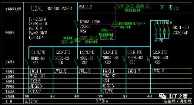 L1。并聯(lián)開關(guān)上方的N.PE指的是采用一路帶電導(dǎo)線,即三項中的一項,加上零線和地線,形成一個1WL1.1回路,電源電壓為220伏。導(dǎo)線規(guī)格WDZ-BYJ-3X2.JDG20-CT,CC指低煙無鹵阻燃交聯(lián)聚乙烯絕緣(銅芯)導(dǎo)線,3根2.5平方毫米,直徑20毫米的金屬管,橋架及沿屋面暗敷設(shè)。同時,標(biāo)記該回路用于照明和備用。照明負載為0.32千瓦,相對較小。